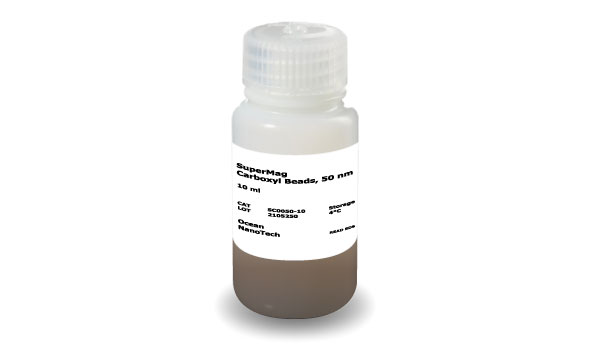 SuperMag Carboxyl Beads are hydrophilic magnetic beads with carboxylic acid groups. These surface groups allow covalent amide bond formation to antibodies, proteins, peptides or other biomolecules via primary amine (NH2) groups. Oligonucleotides, antibodies or other ligands with amine groups can be easily coupled to the beads. Activation through carbodimide is required. With large surface area, excellent colloidal stability and unique surface coating, SuperMag Carboxyl Beads exhibit high binding capacity and low non-specific binding of protein or nucleic acids.
